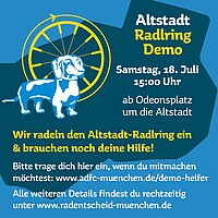 Altstadt-Radlring-Demo am Samstag, den 18. Juli. Start 15 Uhr am Odeonsplatz Endlich kommt der Sommer und endlich dürfen wir auch wieder Radl-Demos veranstalten. Denn wir sind nach wie vor unzufrieden! Zwar gibt es seit dieser Woche sechs Pop-Up-Radwege in München, aber bei der Umsetzung des Altstadt-Radlrings und des Radentscheids geht es immer noch viel zu langsam und schleppend voran. Das ist auch kein Wunder, da immer noch viel zu wenige Mitarbeiter:innen in der Stadtverwaltung dafür eingesetzt werden. Ein so großes Projekt lässt sich aber nicht mit einer Handvoll Mitarbeiter:innen bewerkstelligen. An dieser Stelle ein großes Dankeschön an diejenigen (wenigen), die sich jeden Tag ausgesprochen engagiert und mit großem Einsatz für unsere Ziele einsetzen! Davon brauchen wir deutlich mehr! Termin Daher plant der Radentscheid München für Samstag, den 18. Juli eine große Altstadt-Radlring-Demo. Start 15 Uhr am Odeonsplatz. Ganz nach dem Motto: "Wenn der Ring nicht zu uns kommt, dann kommen wir zu ihm". Einen ganzen Nachmittag lang wollen wir den Altstadt-Radlring daher schonmal einradeln und gemütlich mit Musik und guter Laune mehrere Runden drehen ;-) Vielleicht schaffen wir auch wieder einen Ringschluss?!? Mithelfen Eine große Demo ist ohne zahlreiche fleißige Helfer:innen nicht zu stemmen und wir brauchen dringend viele (mitfahrende!) Ordner:innen und Helfer:innen! Bitte tragt euch dazu unter http://www.adfc-muenchen.de/demo-helfer ein. Corona & Hygiene Radlfahren ist sicher und es besteht praktisch keine Gefahr sich anzustecken. Das zeigt sich derzeit jeden Tag auf unseren vollen Radlwegen, auf denen sich vielfach keine 1,5m (seitlichen) Abstand einhalten lassen: Wäre Radlfahren ansteckend, hätten wir andere Infektionszahlen. Trotzdem wird es natürlich bei der Demo ein striktes Hygiene-Konzept geben. Das finale Hygiene-Konzept werden wir veröffentlichen, sobald dieses von den Behörden genehmigt wurde. Facebook-Veranstaltung & Flyer Hier ist die Facebook-Veranstaltung zur Demo: