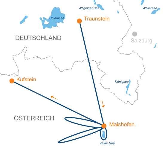 Von Traunstein radeln wir durch tiefe Alpentäler Richtung Süden. Entlang der Saalach erreichen wir unser festes Quartier in der Nähe des Zeller Sees. Von dort führt uns eine Tagestour nach Saalbach-Hinterglemm, die zweite geht ins Salzachtal, wo wir ein Stück des bekannten Tauernradwegs kennenlernen. Ein besonderes Naturschauspiel bietet der Besuch der Sigmund-Thun-Klamm. Zurück fahren wir entlang des beeindruckenden Kaisergebirges nach Kufstein.