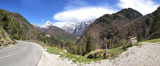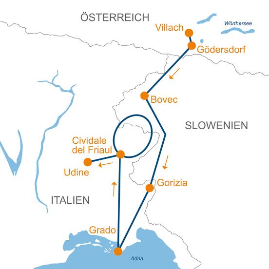 Unsere Tour führt uns von Villach über Tarvisio und das Bergwerksdorf Raibl (Besichtigung) zum Predil (1156 m), der Grenze zwischen Italien und Slowenien. Nach einer langen Abfahrt folgen wir der Soča bis zu ihrer Mündung in die Adria. Dazwischen wartet die Tolminer Klamm auf uns. Über Grado und Cormons geht es anfangs flach, später hügelig in die slowenische Toskana und weiter ins Friauler Voralpenland. Ein langer Anstieg auf den Kolovrat wird mit einer schönen Abfahrt belohnt. Entlang der Flusses Natisone kommen wir wieder ins Friaul. Zur Provinzhauptstadt Udine sind es am letzten Tag nur noch wenige Kilometer.