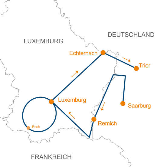 Entlang der Saar und Mosel erreichen wir bei Wasserbillig Luxemburg, mit schönen Blicken auf den Fluss. Schengen und die Hauptstadt, die wir uns bei einer Führung näher bringen lassen, stehen am zweiten Tag auf dem Programm. Der Höhepunkt ist ein bedeutendes Industriedenkmal: der Hochofen Belval. In 40 m Höhe haben wir einen herrlichen Rundumblick. Atemberaubende Blicke über Land und Tal begleiten uns auch am 4.Tag, der überwiegend an der Alzette und an Bahntrassenwegen verläuft. Die älteste Stadt Luxemburgs, Echternach, ist auch einen Besuch wert. Entlang der Sauer und Mosel wird unser Ziel in Trier erreicht.