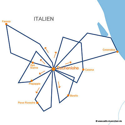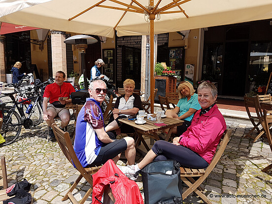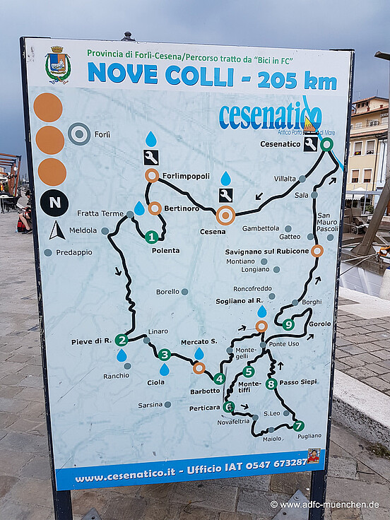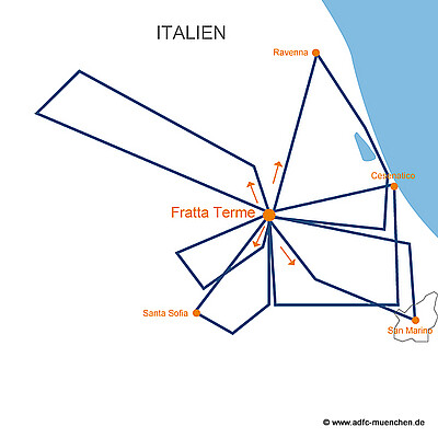 Die Provinz Forli-Cesena im östlichen Teil der Emilia-Romagna ist das grüne Herz der Romagna. Ob Touren- oder Rennradler/in: hier in den Ausläufern des Apennin mit ihrem milden Klima finden Sie ideale Bedingungen, um zu Saisonbeginn wieder "Tritt zu fassen". Mit vier Guides in zwei - nachmittags auch in vier - Gruppen erleben Sie traumhafte Touren: Zum einen viel "Auf und Ab" mit atemberaubenden Aussichten und pittoresken Dörfern - für Rennradler z. B. die berühmten "Nove Colli" und lange Anstiege in den Hochapennin bis in die Toskana. Zum andern raus aus den Bergen und Zeit zum Bummeln in den historischen Altstädten von Faenza, Forli, Cesena und Cesenatico an der Adriaküste.