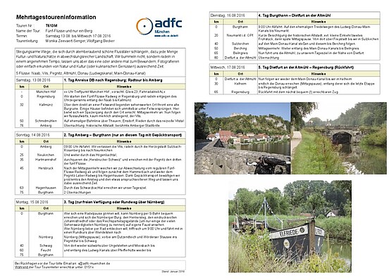 Steigungsarme Wege in moderatem Tempo, die sich durch atemberaubend schöne Flusstäler schlängeln, dazu jede Menge Kultur- und Naturschätze in abwechslungsreicher Landschaft. Von Regensburg aus durch das malerische Kallmünz bis Amberg (ÜN). Am 2. Tag gönnen wir uns einen Gepäcktransport, um durch die leicht hügelige Fränkische Jura (mit einer stärkeren Steigung) nach Burgthann (2 ÜN) zu gelangen. Ein Rundkurs führt uns am 3. Tag durch Nürnberg (Sightseeing). Am 4. Tag radeln wir, nun wieder mit Gepäck, entlang des idyllischen Ludwigskanal und weiter bis Dietfurt an der Altmühl (ÜN). Tag 5 führt uns über Kelheim wieder nach Regensburg.