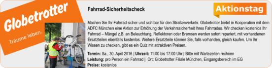 Liebe Mitglieder, liebe Interessierte, die Sonnenstrahlen zeigen sich immer mehr in München und Umland und lassen auch immer mehr Radler ihr Gefährt aus dem Keller bringen. Auch für uns stehen im April wieder ein großes Programm und zahlreiche Veranstaltungen an. Doch lest selbst. Für die DEMO suchen wir dringend Unterstützer und Ordner. Bitte bei Andreas melden (andreas.groh(..at..)adfc-muenchen.de) Feedback, Anregungen und Artikel könnt Ihr gerne direkt an uns senden. Wir sind dankbar für jeden Beitrag (newsletter(..at..)adfc-muenchen.de). Der nächste Newsletter erscheint voraussichtlich am 15. Mai. Weiterhin gute Fahrt!