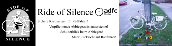 Liebe Mitglieder, liebe Interessierte, Eine große Veranstaltung jagt die andere bei uns und in der kommenden Woche am Mittwoch, 16.5., findet wieder der Ride of Silence statt. Dieser hat insbesondere in den letzten Wochen wieder traurugen Anlass um auf die Straße zu gehen. Der Ride of Silence wird auch in Erinnerung an den Unfalltod der 9-jährigen Lorelei stattfinden. Datum: Mittwoch, 16. Mai 2018. Start ist an der Bavaria um 18:30 Uhr. Für den Ride of Silence suchen wir noch Unterstützung (Helfer/Ordner). Wer sich engagieren möchte kann sich hier melden. www.adfc-muenchen.de/rideofsilence