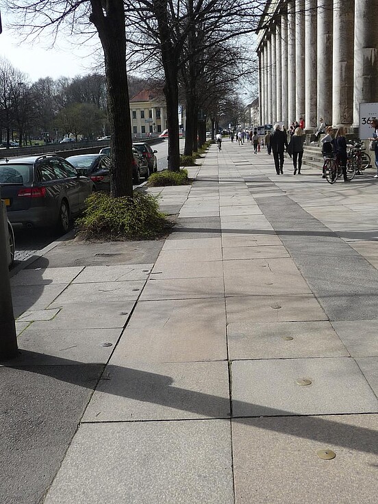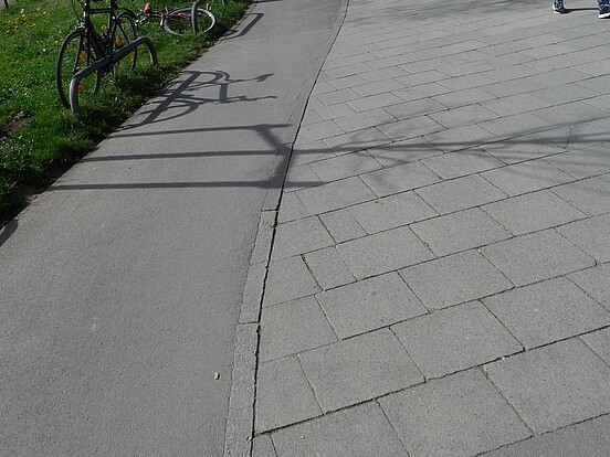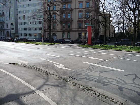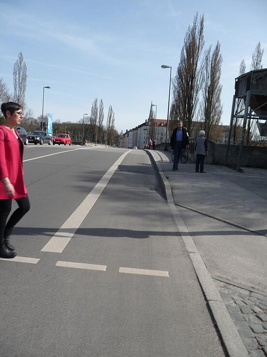 Zufahrt zur Reichenbachbrücke: Geradlinige Querung nur mit Wartezeit an der Ampel möglich. Zufahrt zur Unterführung stark verschwenkt sowie Querung des Fußweges.