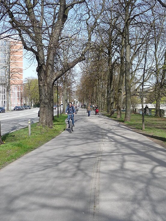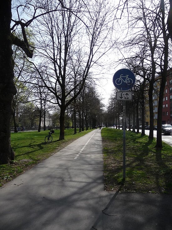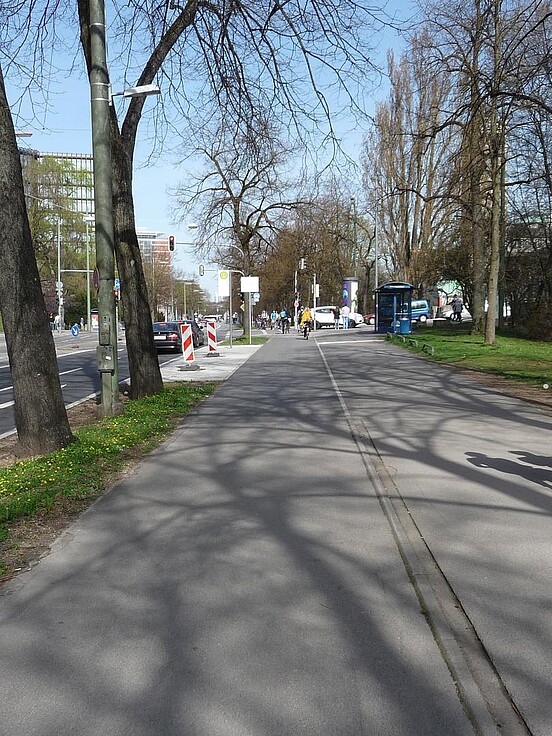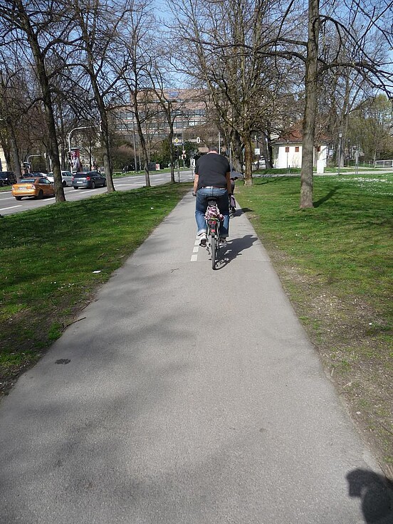 Jetzt geht es los: Schöner über 3m breiter Radweg. Gleichzeitiges Überholen für beide Fahrtrichtungen jedoch nur unter Missachtung von Sicherheitsabständen möglich. Für (Zweirichtungs)Radschnellwege plant man daher mit 4m Breite.