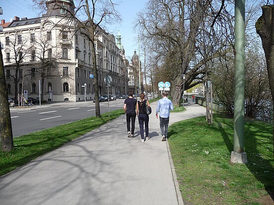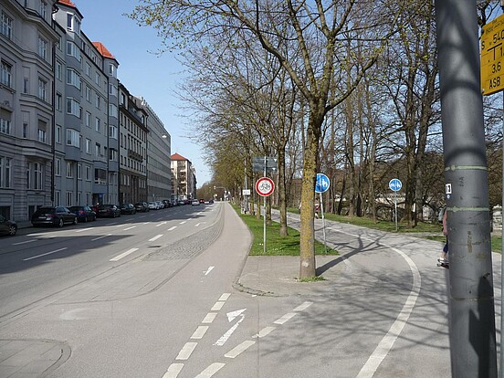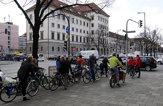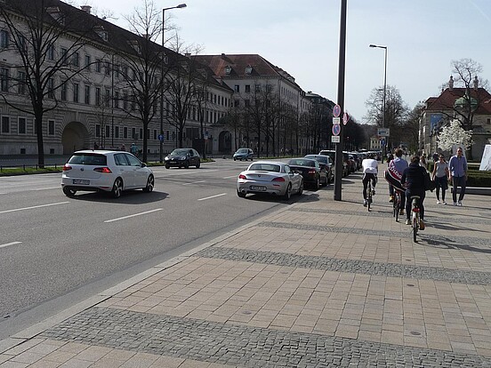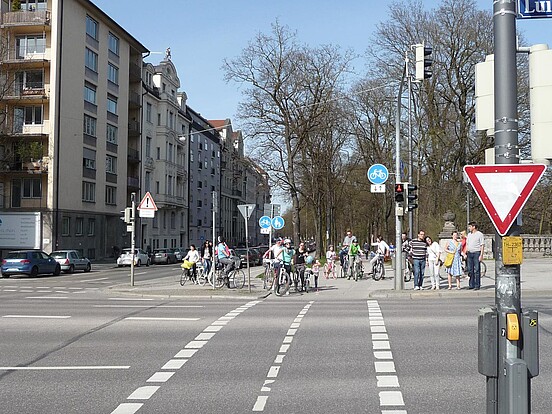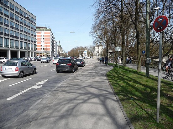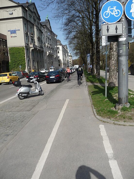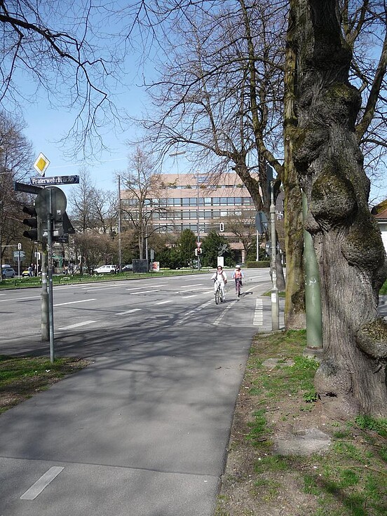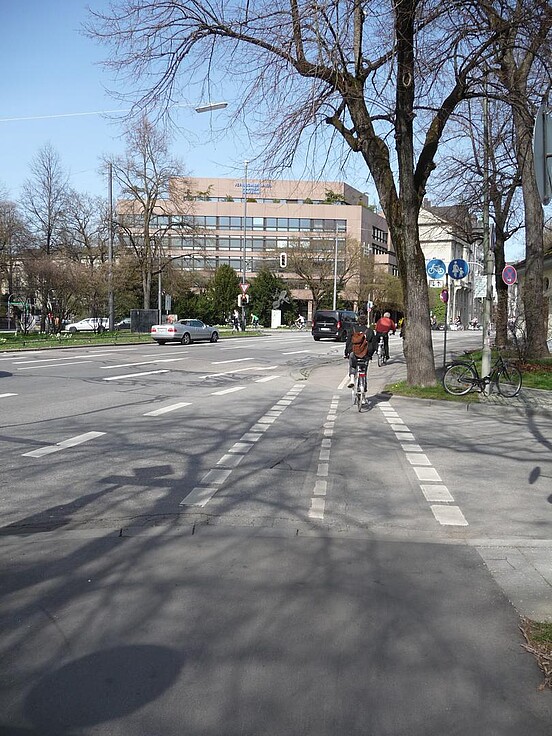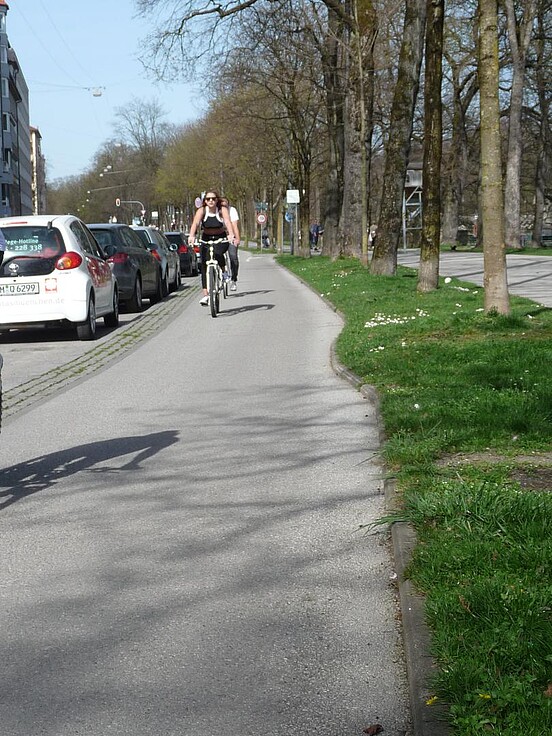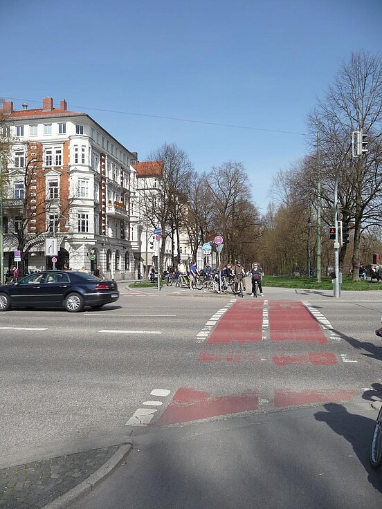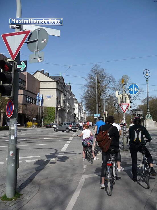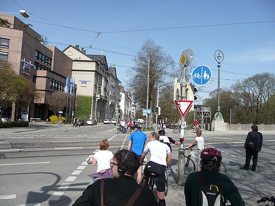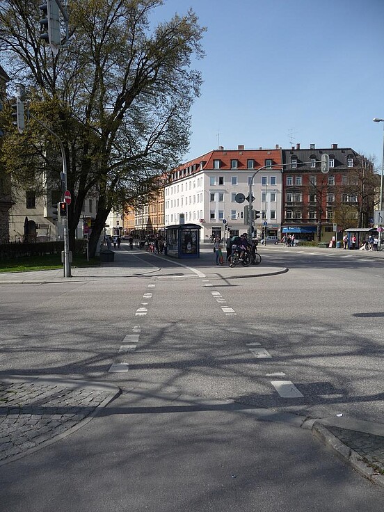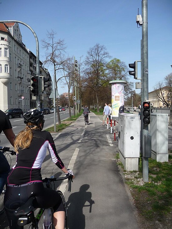 Isarradweg/Wittelsbacherbrücke: Starke Verschwenkung des Radverkehrs. Viel zu schmale Radwegfurt für Zweirichtungsverkehr. Keine Wartemöglichkeiten für linksabbiegende Radfahrer. Konflikte mit querendem Radverkehr und wartenden Radfahrern aufgrund zu wenig und unklarer Aufstellflächen. Keine eigene Radlerampel vor der Kreutzung.